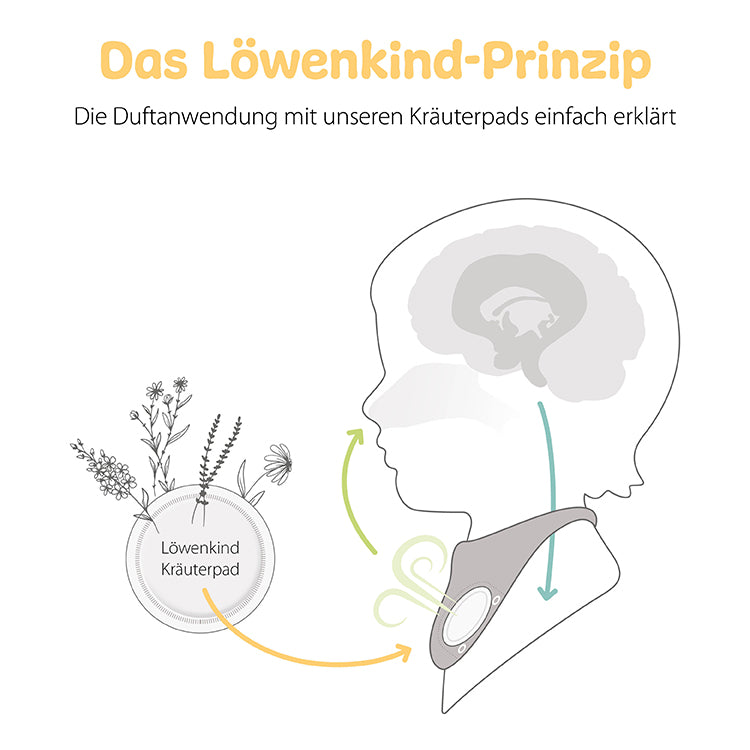 Das Kräuterpad wird ins Löwenkind Halstuch gesteckt. Dank der Körperwärme wird der Duft der Kräuter verstärkt.