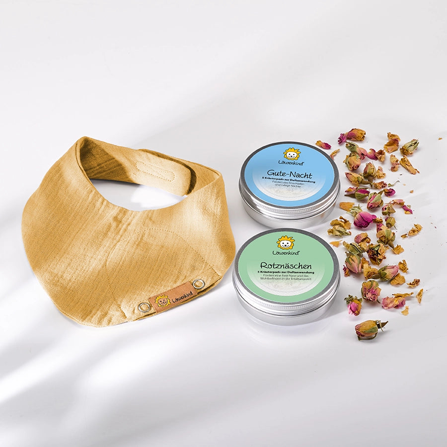 The herbal pad is placed inside the Löwenkind scarf. Thanks to body heat, the scent of the herbs is intensified.