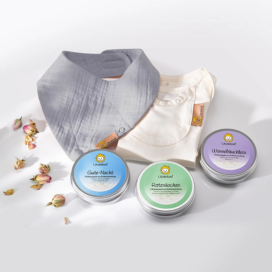 The set includes a selectableTriangle scarf-Mini (0-4 years) or Medi (4-12 years), aLong-sleeved bodysuit(0-1.5 years) and3 herbal pad tins(Good night, little snotty nose, little tummy).