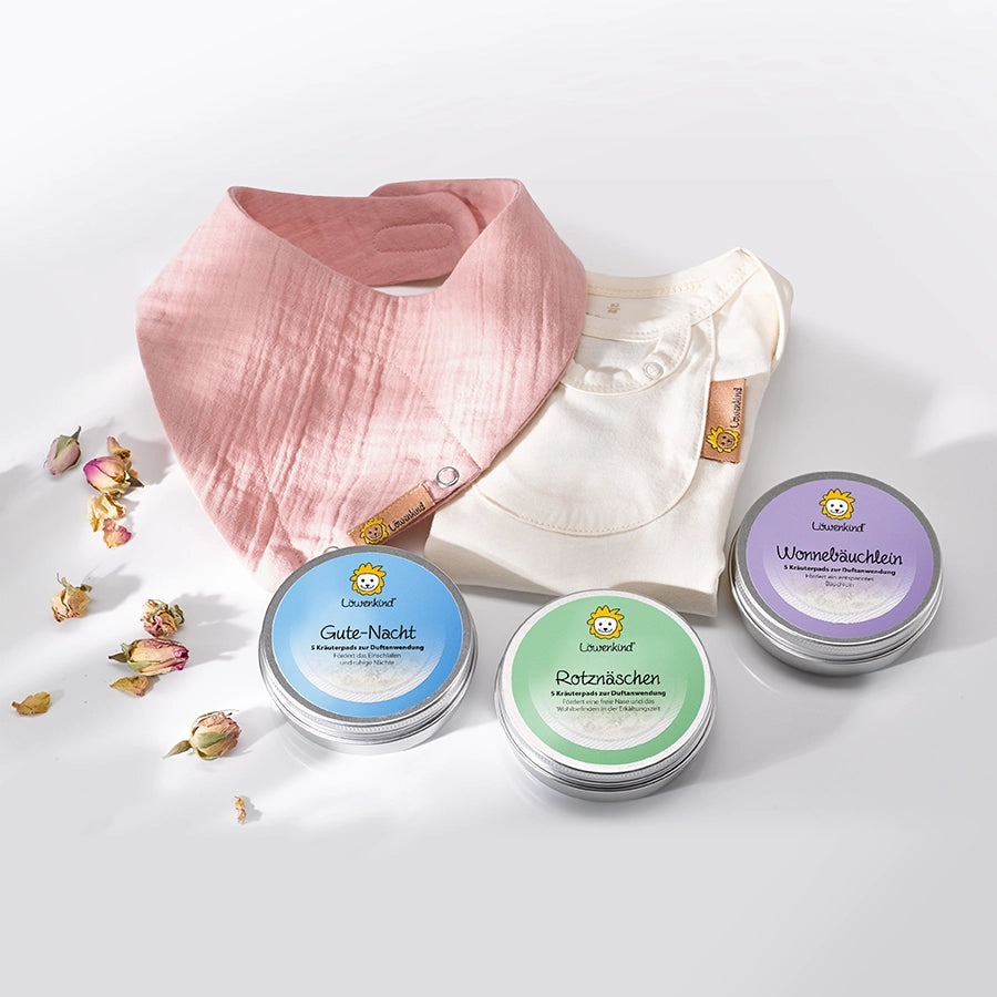 The herbal pad is placed inside the Löwenkind scarf. Thanks to body heat, the scent of the herbs is intensified.