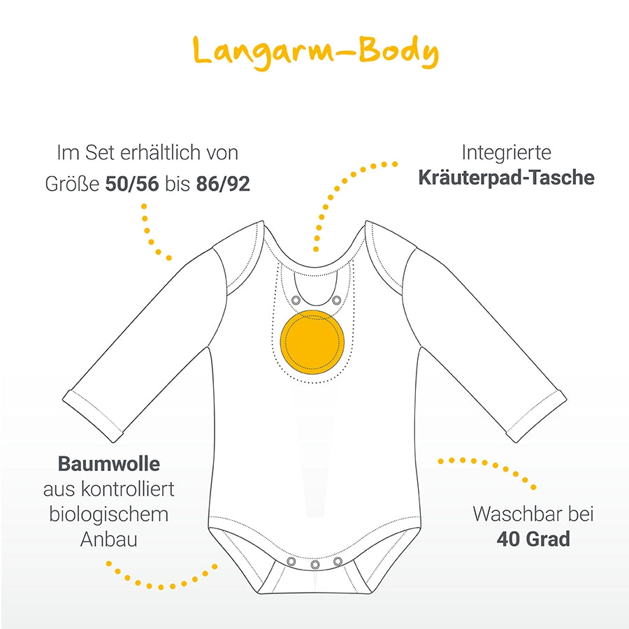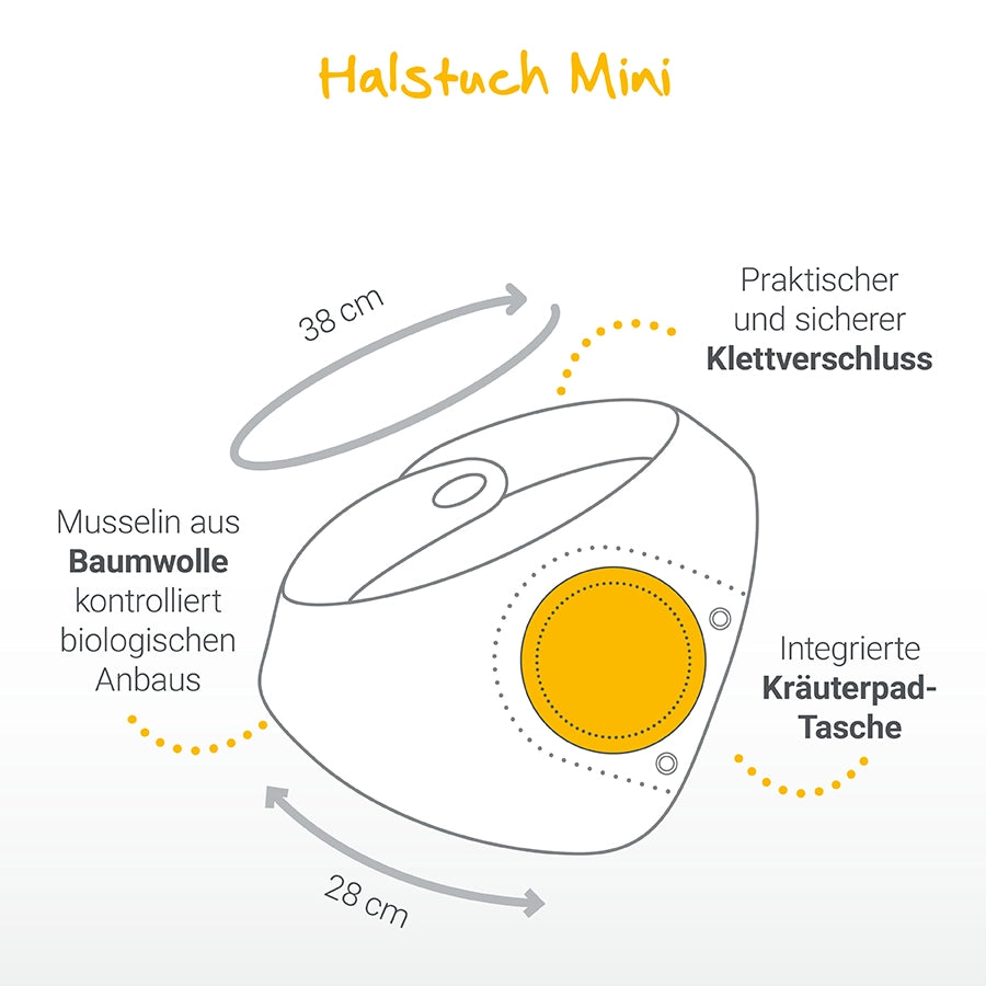 There is a special pocket integrated into both the body and the scarf into which the herbal pads are placed. The use is completely uncomplicated. The healing effects of the herbs are activated immediately by the child's body heat alone. You don't have to heat anything or moisten anything! Very simple, put the pad in - let it work - remove the pad.