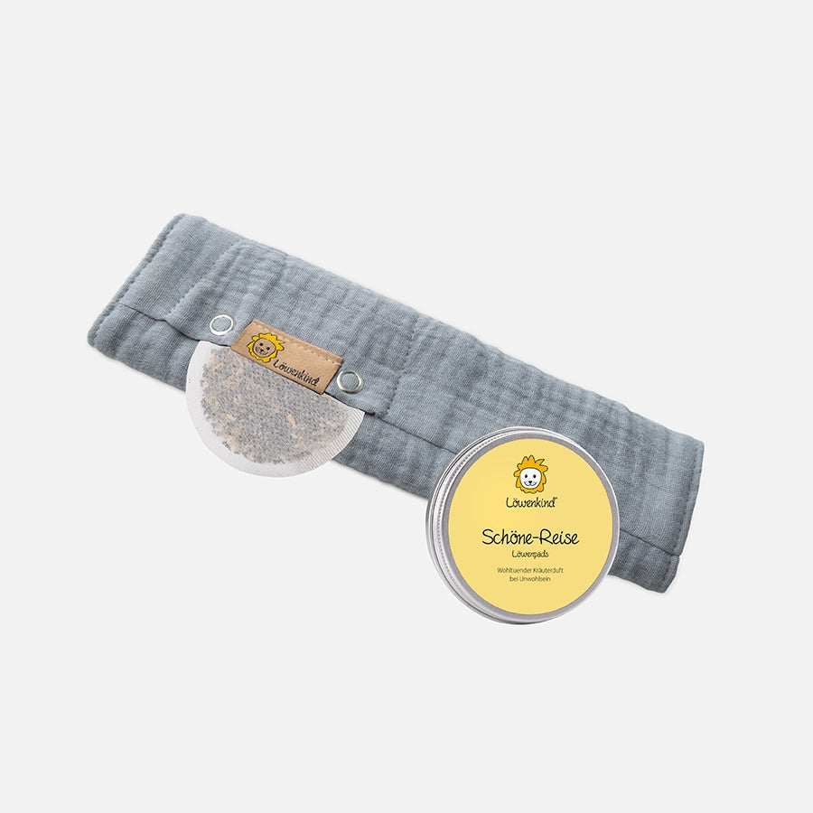 The Good Journey Set contains a seat belt protector and a herbal pad tin for pleasant car journeys.
