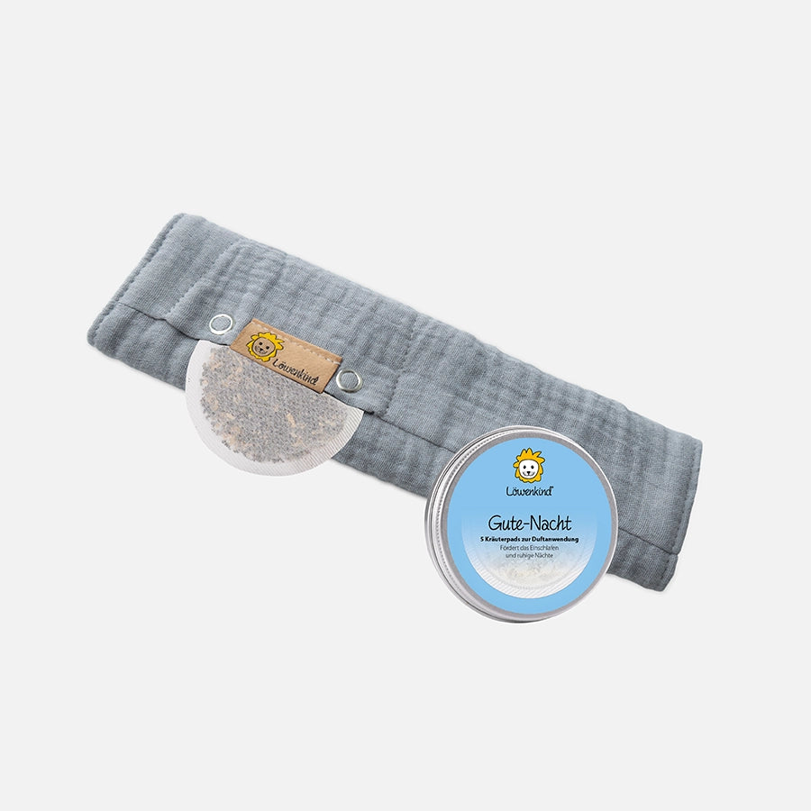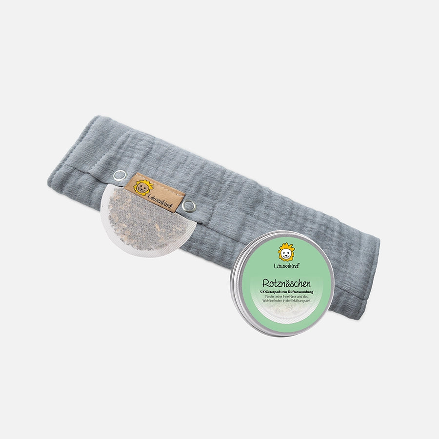 Das Kräuterpad wird ins Löwenkind Halstuch gesteckt. Dank der Körperwärme wird der Duft der Kräuter verstärkt.
