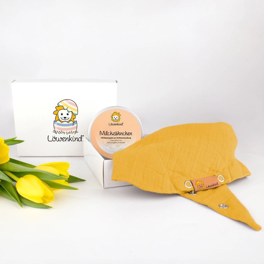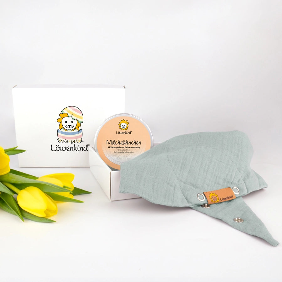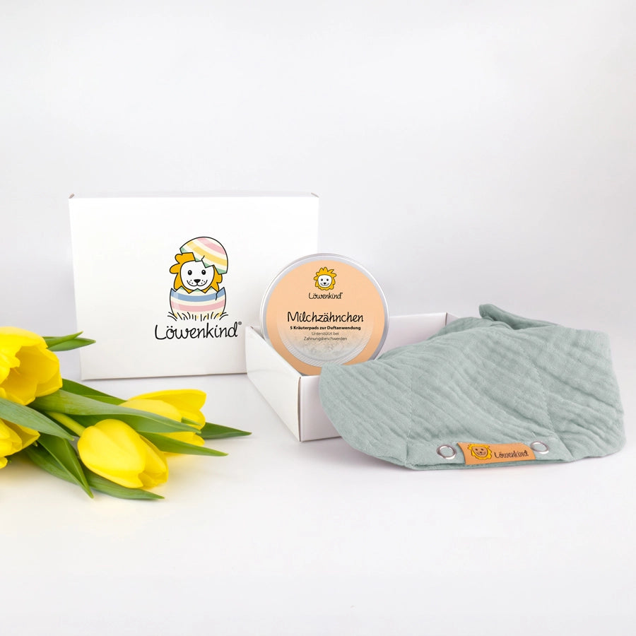 Das Oster-Special kommt in einer Oster-Geschenkbox und enthält ein Musselin-Halstuch (Mini oder Medi) in verschiedenen Farben und eine Kräuterpad-Dose nach Wahl.