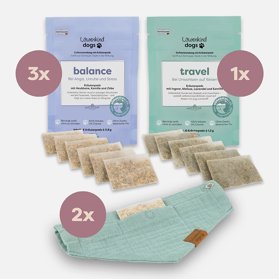 Das Set unterstützt Deinen Hund in allen Momenten, die Stress, Unruhe oder Unsicherheit auslösen können – etwa bei Besuch, Lärm, Alleinbleiben, Autofahrten, Reisen oder neuen Umgebungen. Es bietet eine natürliche, sanfte Begleitung für Alltag und unterwegs.