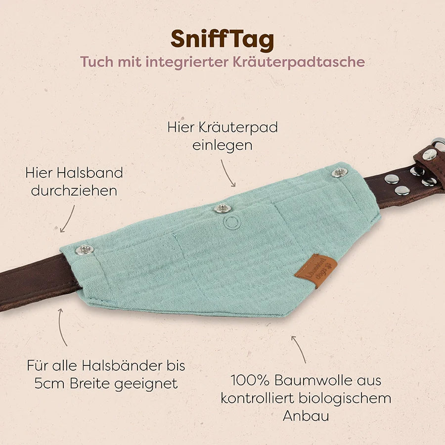- Set beinhaltet 1x Snifftag (Halsbandtuch) mit integrierter Padtasche und Öffnung für Halsband (bis 5cm. Breite) und 1x 6 Stück Travel Kräuterpads