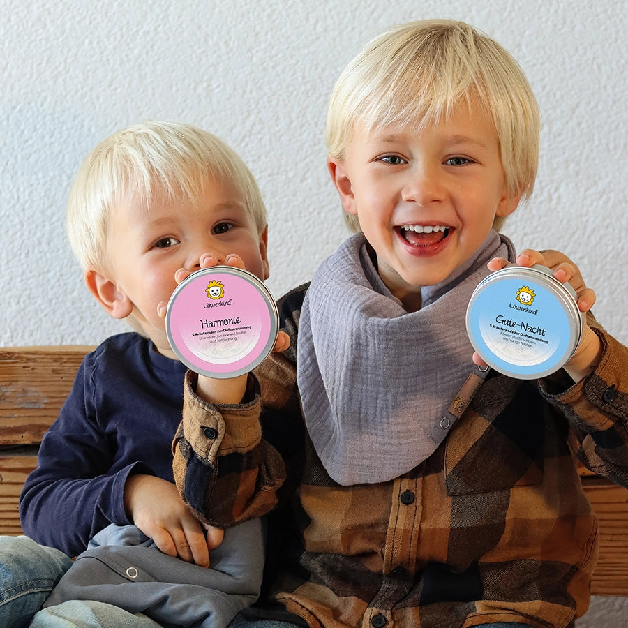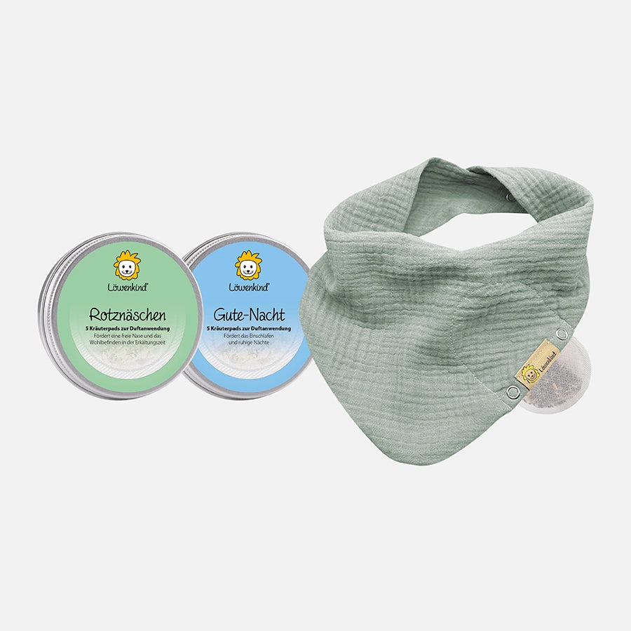 Das Set enthält das Musselin-Dreieckstuch Medi (4-12 J.) sowie 2 Kräuterpad Dosen Deiner Wahl.