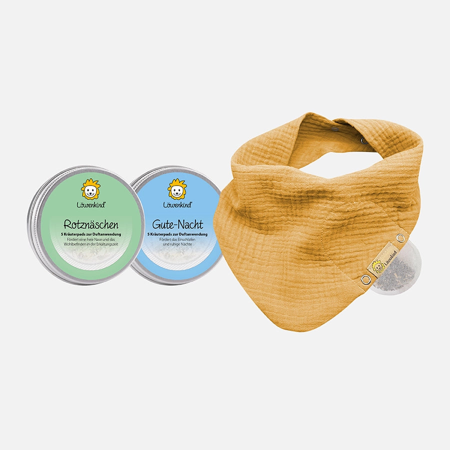 Das Kräuterpad wird ins Löwenkind Halstuch gesteckt. Dank der Körperwärme wird der Duft der Kräuter verstärkt.