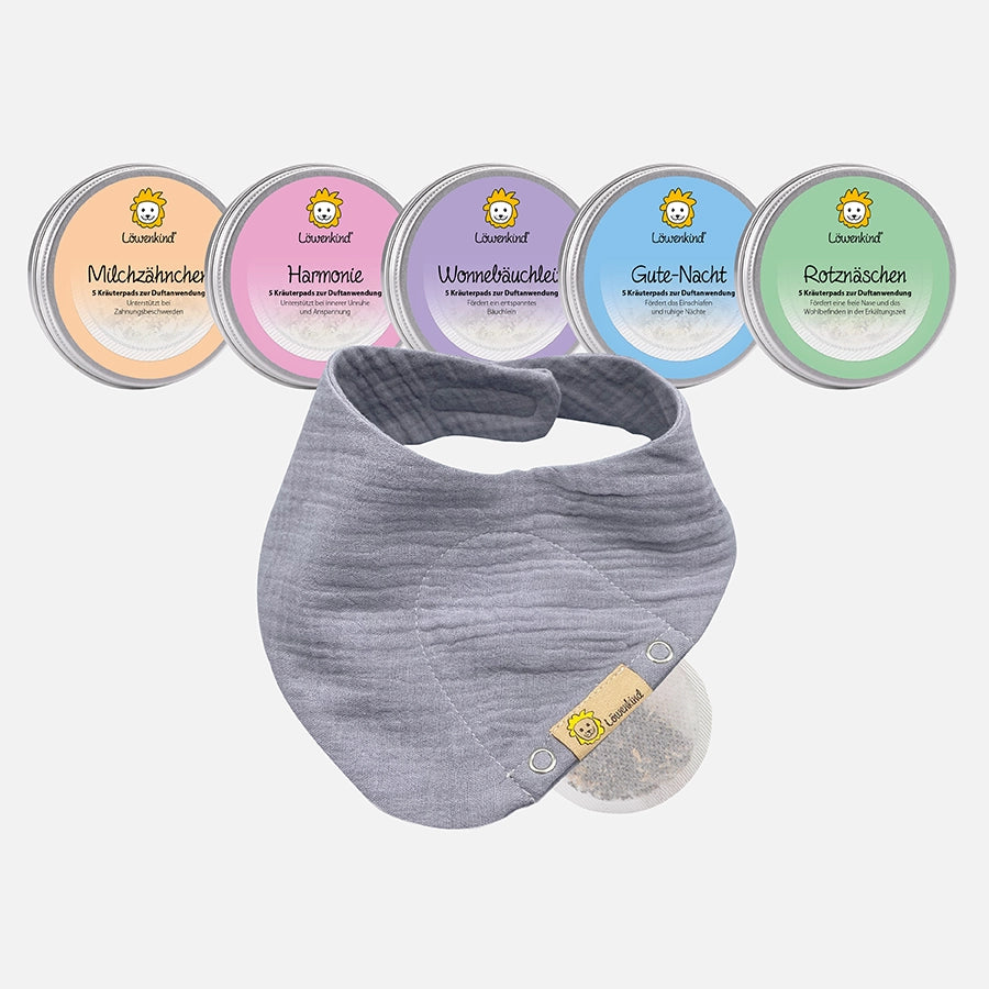 Das Rundum-Sorglos-Paket für Babys beinhaltet ein Musselin-Halstuch "Mini" aus 100% Bio-Baumwolle (0-4J.) und fünf Kräuterpad-Dosen für alle Kinder-Wehwehchen.
