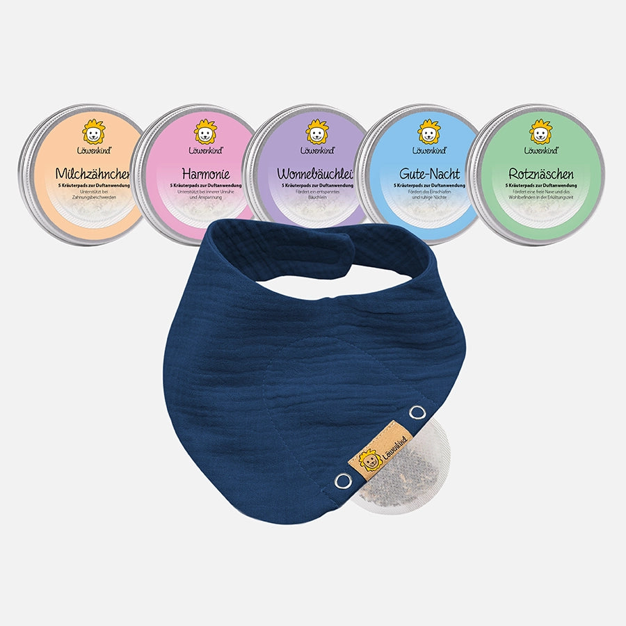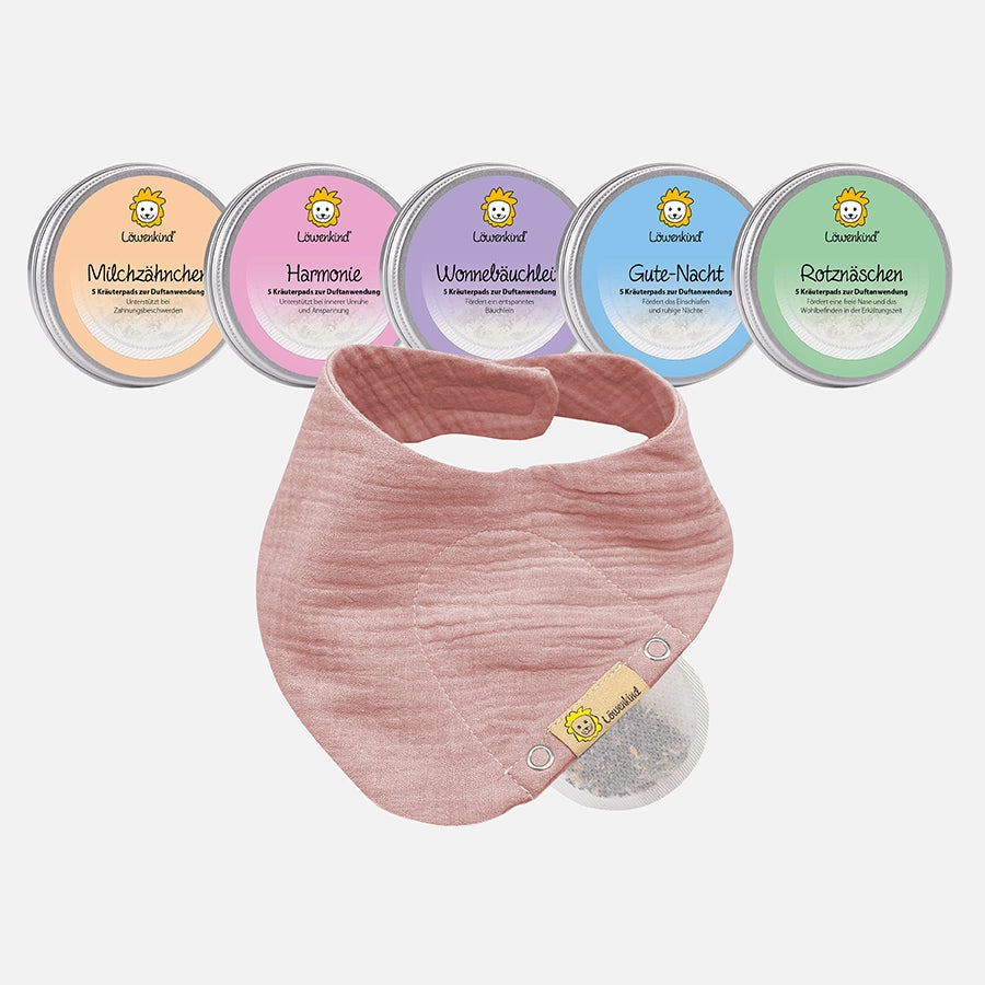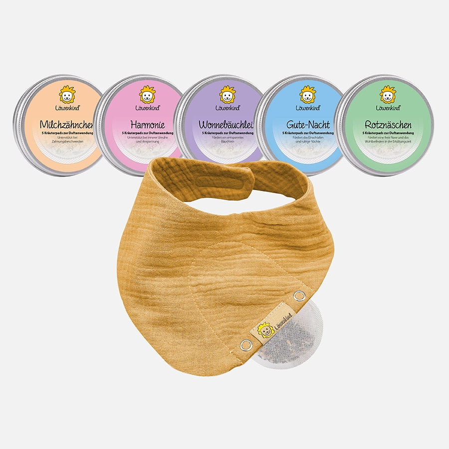 • Musselin-Halstuch Mini (0-4 Jahre) mit integrierter Tasche für die Kräuterpads + 5 Kräuterpad-Dosen (je 5 Kräuterpads), ab Geburt geeignet