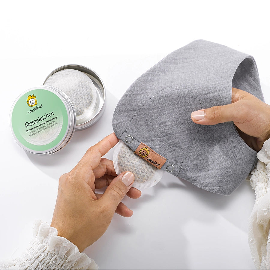 Das entsprechende Kräuterpad wird in die dafür vorgesehene Pad-Tasche des Löwenkind Halstuchs eingelegt. Durch die Luftdurchlässigkeit in Kombination mit der eigenen Körperwärme, werden die Düfte der Kräuter verbreitet.