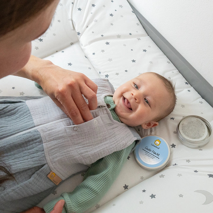 Das Schlafsack Einsteigerset enthält einen Musselin-Schlafsack, eine Kräuterpad Dose mit 5 Pads und eine 10er Nachfüllpackung.
